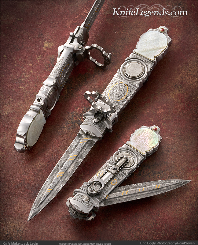 Comments: This is a classic folding Dagger by New York knife making wizard Jack Levin. It has all of the Levin hall marks and is full of interesting and unique details. This includes the complex opening release as well as extensive fluting and machining throughout the knife.