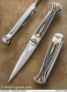 The knife that first inspired him to become a knifemaker was photographed by Jim Weyer and is included in his Points of Interest, Book II. This was a large dagger knife with an ivory handle and intricate guard. Over the years, Loerchner has designed and crafted many different styles of knives, using a variety of materials. In addition, he has collaborated with numerous well-known artists like Martin Butler, Lytton McKenzie, Rick Fields, Ron Lake, Ron Skaggs, and Elizabeth Loerchner.